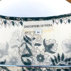 Effortless and romantic, this Daughters of India Rooh mini dress is crafted in breathable cotton with a pine green hand-block print. The airy silhouette and embroidered sleeves give it a bohemian chic vibe, perfect for coastal vacations, summer festivals, or everyday wear. A versatile turquoise hue flatters every season, while the tiered skirt adds a touch of feminine movement. Whether styled with sandals for resortwear or layered with boots and a jacket, this artisan-made dress embodies timeless slow fashion and boho elegance.