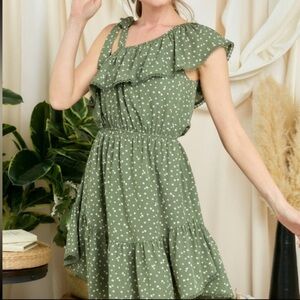Davi Dana polka dot green one shoulder sleeveless mini dress with lace trim