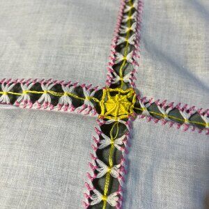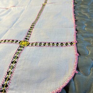 Delicate Vintage White, Pink and Yellow Linen Table Cloth 36.5 x 34 inches
