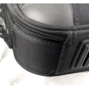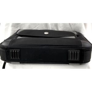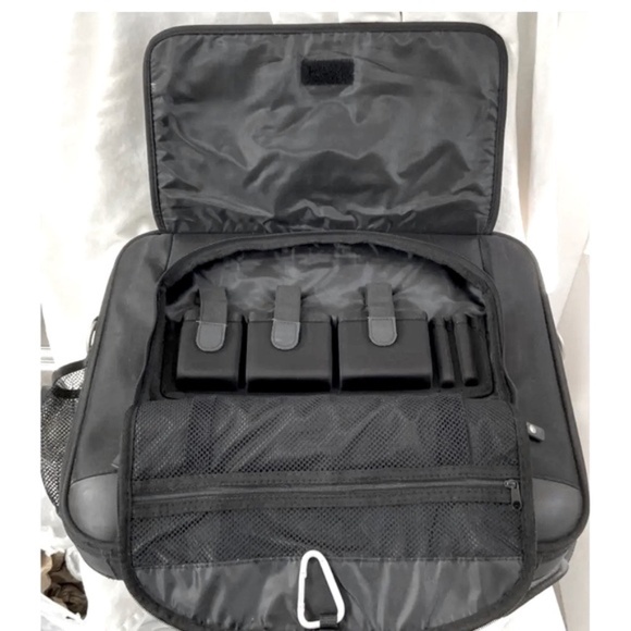 On front; slide in slot, flap over with Velcro closer, with double zip closer compartment, inside clip, mesh zip pocket and 3 side into slots and 3 pen slots.