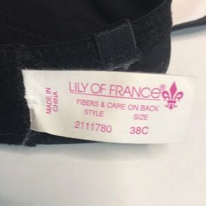 Features: underwire cups, adjustable straps, hook and eye back closure, scalloped edge cups, bow detailing, and pink cup interior.