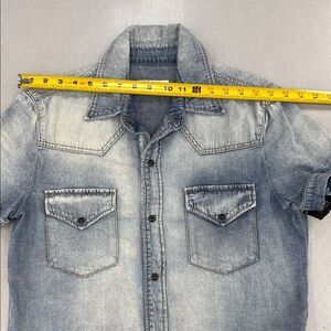 Stylish denim short sleeve shirt with button-up front and chest pockets. Perfect for casual wear.