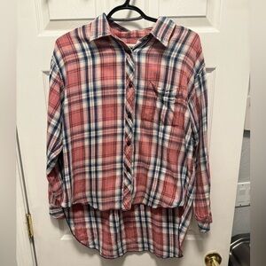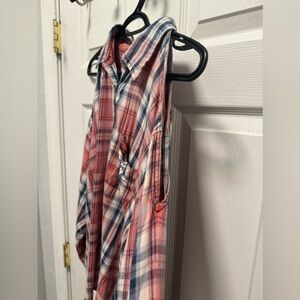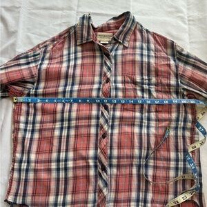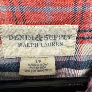 Denim & Supply by Ralph Lauren plaid cold shoulder button down. Great color combo in a pinky red and steely blue. Hi-low cut. Size: small. In very good, pre-owned condition. Cute and sassy...this would be great paired with your favorite denim and boots. Sizing in picture.
