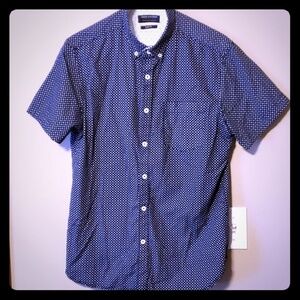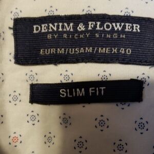 Great condition ricky singh denim and flowers button up short sleeve navy with white and light blue flower pattern slim fit great shirt size medium