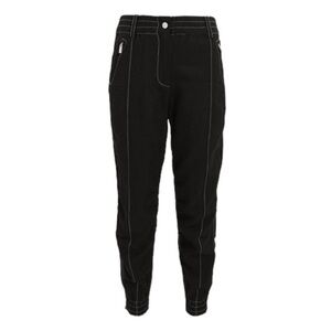 Cropped linen-blend joggers with white contrast stitching for a utility-inspired finish. Elasticized waistband and cuffs. Zip fly and button closure. Side pockets with zip closures. Zip closures at the cuffs and back pockets. Silver-tone hardware. Drop crotch. Relaxed fit. In black.