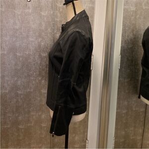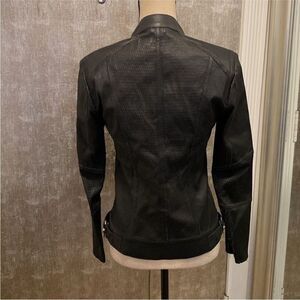 Elevate your style with this sleek black leather jacket. Perfect for any occasion, it offers both comfort and sophistication. Excellent condition