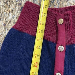 This is a charming vintage wool cardigan featuring a rich navy blue body with deep burgundy trim at the collar, button placket, cuffs, and hem. It has a classic crew neckline and front gold-tone buttons for closure. The standout detail is a front chest pocket adorned with a colorful, folk-style pattern that adds a unique and playful touch. The knit is thick and cozy, making it ideal for cooler weather. A timeless piece with a nostalgic, handcrafted aesthetic