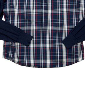 Desigual Button Front Shirt L Blue Plaid Knit Long Sleeve Elbow Patch Graphics