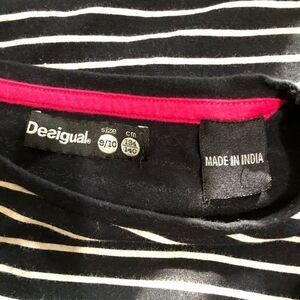 Pink band across front bottom with “Desigual” printed on at bottom left and sequins top and bottom border