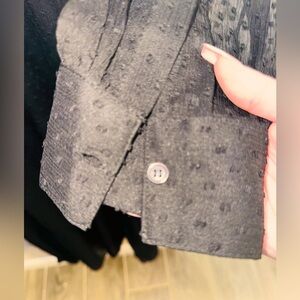 > Discover the perfect blend of sophistication and modern style with this beautiful sheer maxi dress from Venus. Featuring a delicate Swiss dot texture throughout, this black dress offers a chic, layered look. It boasts a classic collared neckline, full button-front closure, and long sleeves with buttoned cuffs. The tiered skirt adds a flowy, romantic silhouette. Ideal for layering over a slip, camisole, or jeans, making it incredibly versatile for various occasions. In excellent, like new condition.