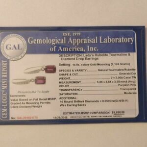 These Rubellite earrings have been Certified, Inspected, and Appraised by Gemological Appraisal Laboratory