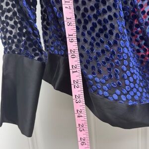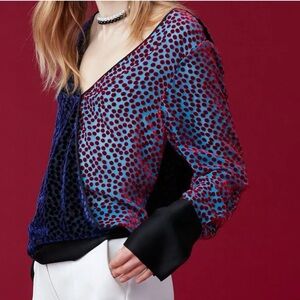 This elegant blouse by Diane Von Furstenberg showcases a wrap-style design in vibrant pink and blue hues. The top features long, billowy sleeves and a plunging V-neckline, crafted from a lightweight fabric that adds a touch of sophistication to any outfit.