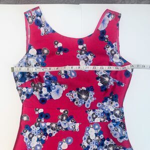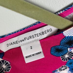 The Topanga dress by Diane von Furstenberg is perfect for any spring or summer occasion. Beautiful silk and wool blend jacquard fabric in a bright pink floral print. This sleeveless fit and flare dress features a crew neckline and includes a hidden side zipper with hook and eye closure. Excellent used condition, women's size 2, measurements pictured.