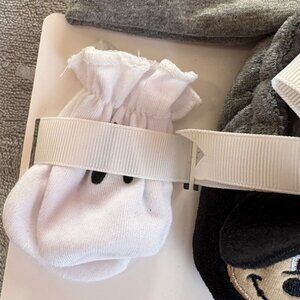 Adorable Disney Baby Mickey Mouse 3-piece infant set, brand new with tags. Includes a cozy grey hat with Mickey ears, soft white mittens, and matching black booties with embroidered Mickey faces. Size 0-3 months. Perfect as a baby shower gift, coming home outfit, or for any little Disney fan.