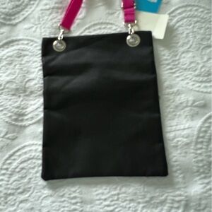Disney Minnie cross body girls bag. Black with white polka dots, pink. Two  zipper front pockets , black back, pink strap. Fun bag for a little girl Great for birthday gifts and much more.  Item # 0113