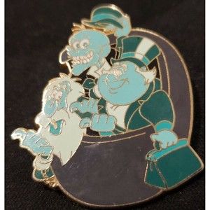 The Hitchhiking Ghosts go for a ride on a doombuggy through the Haunted Mansion attraction in this collectible pin. Green-colored Gus, Ezra and Phineas sit in a dark-grey attraction vehicle, with their thumbs out. Size: approx. 1 3/4" H x 1 1/2" W. Back of pin: gold-finished, sand-textured. Pin as pictured.