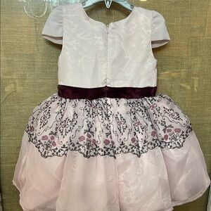 Charming pink dress with floral embroidery. Features a maroon waistband for added elegance.