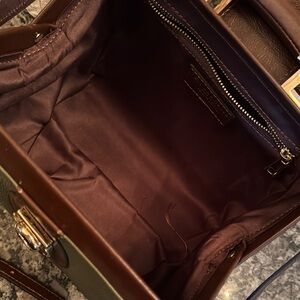 Elevate your style with the handbag. Crafted in elegant green and brown leather, this bag is perfect for any occasion. The gold accents add a touch of luxury.