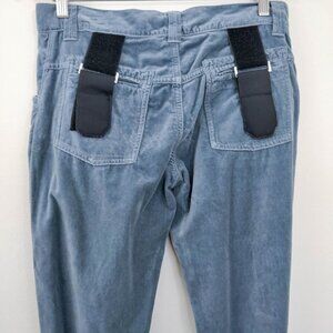 Rare runway style. Y2k punk blue-grey velvet pants with black velcro buckle straps around the ankles and calves. Black straps also on the back pockets.