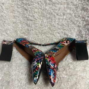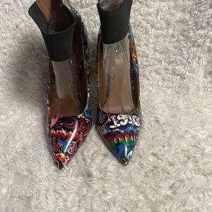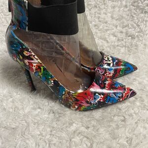 Dollhouse Synthetic Patent Graffiti print multi color ankle strap heels back zipper SZ9 Pointed toe. Pre owned in good used condition a small peeling on the inner soles. M3