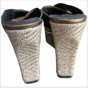 These stunning wedges feature a comfortable elastic crossover strap design in tan with bronze metallic leather accents. The natural woven wedge heel gives these sandals a sophisticated, summery look that pairs perfectly with everything from casual sundresses to elegant resort wear.