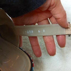 Great condition authentic Donald J Pliner tan suede bootie with Montana beads covered on stacked heel . peep toe . back cut out soft fringe stacked heel approximately 3 1/2 inches