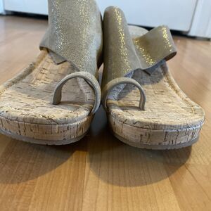 Donald Pliner Gyer Sandals Women's Size 10 Tan Gold Leather Cork Wedge Toe Loop