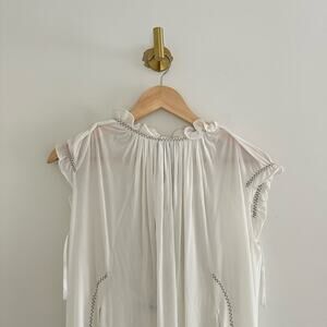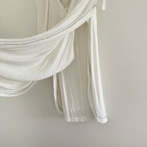 Details: Donna Karan Ultra Matte Jersey Open Side Blouse - Size: S- Color: White- Material: 92% Viscose, 8% Elastane- Features: Sheer, pullover, tie front, side slits, ruffles, lightweight, comfort, breathable, V-neck. A40T777A59