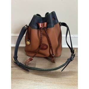 Dooney & Bourke All Weather Leather Drawstring Vintage Purse Tan Green Blue