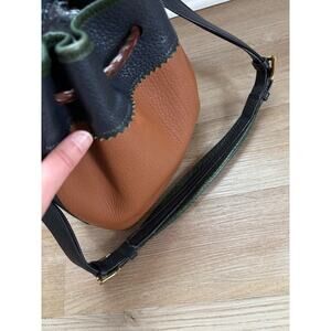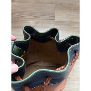 This bag is in excellent vintage condition from a clean, smoke free home. Features original All Weather Leather with brass buckles, signature fob and interior key ring. Drawstring closure with roomy interior and attached key holder. Adjustable leather strap with wide top for comfort. Strap buckle adjustability for a perfect, customized fit. Tan, green and blue. Perfect for  year-round wear! Normal scuffs on leather from use and wear.