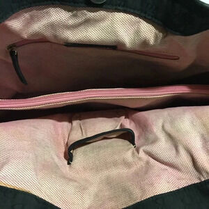 authentic dooney & Bourke Black Cotton/ Canvas tote/ shoulder handbag with leather trim & Strap with silver-tone hardware 3 compartment 2 pocket at interior wall 1 zip closure & snap closure at top exterior 2 side snap pocket hight 11.5” width 18” depth 6” Strap drop 10”pink cotton lining fabric, lining have some stains please check all photos
