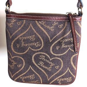 Chic crossbody bag with signature heart pattern. Features a front pocket , zipper top , inside classic Dooney red fabric. excellent condition. a couple of small ink spots ..adjustable strap.