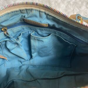 Dooney & Bourke PVC Multi color logo Bagette shoulder bag. Tan leather trims