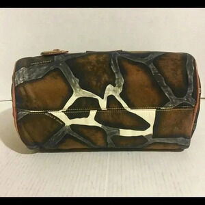 Authentic dooney & Bourke Nylon print satchel handbag with brown leather strap & trim with gold tone Strap have some discoloration hardware main compartment 3 pockets at interior wall 1 zip closure & zip closure at top logo & hangtag at front red cotton fabric lining key hook minor crease please check all photos hight 9” width 11” depth 7” strap drop 5” logo print coated logo