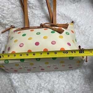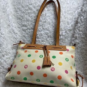 Dooney &Bourke Beige canvas multi color polka dots tan leather trim shoulder bag