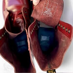 Cherry red smooth leather with an exposed steel capped toe (EST), these 10 eyelet boots have traditional compression Goodyear welted ripple soles, with no visible stitching.