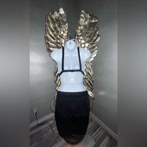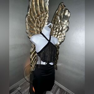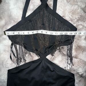 In great conditions, worn once, this dress has cut-outs on side and dangling fringe chains on chest area. Adjustable straps.