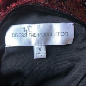 Beautiful sequined dress from Dress The Population. Plunging back. Zipper close. Long sleeves. Stretchy