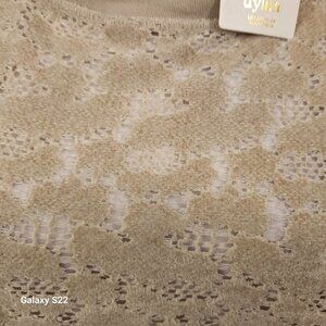 Dylan Developed by True Grit Sweater. Tan color. Size Small. NWT. No rips/stains or tears. Etched detail, but not so much you necessarily need a under cami, see final picture, I put my hand under the material so you can see how much shows through.  Velour like material, and the cowl neckline if soft and more a medium thick cotton feel. Measurements: Pit to Pit: 18 inches.    Shoulder to bottom: 24 inches.      Not much stretch.  Smoke free home. No odors. All offers are welcome. Thank you!