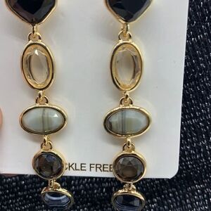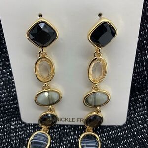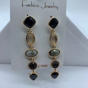 These fashionable pierced earrings are 3” long and nickel free. Color of stones are black, cream clear, grey, grey clear, dark grey.