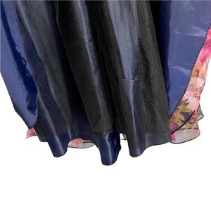 DETAIL: COLD SHOULDER RUFFLE. INVISIBLE ZIPPER DOWN BACK. REMOVABLE SASH BELT. FLORAL ORGANZA OVER TOP OF LINING AND CRINOLINE.
