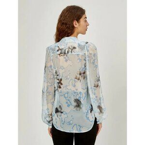 Plein air blue silk Linneta silk shirt from EQUIPMENT featuring abstract pattern print, semi-sheer construction, straight-point collar, concealed front button fastening, long puff sleeves, buttoned cuffs and curved hem.