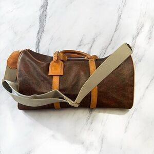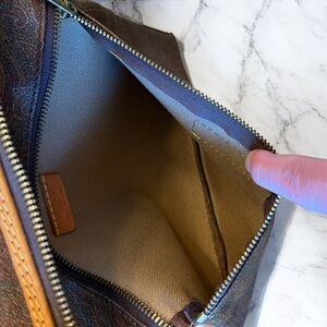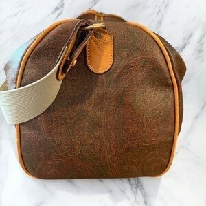 The bag features the original detachable shoulder strap, authentic gold-tone ETRO lock with key, and leather ID tag—all of which are often missing from bags this old. The canvas is richly detailed and shows beautifully with minimal wear for its age. Leather trim and handles show some gentle patina and light surface wear, especially on the corners and handle bases, but nothing that detracts from its classic luxury look. Stitching is tight, zippers work perfectly, and the structure is still strong. The interior is near flawless with only a couple discoloration spots.