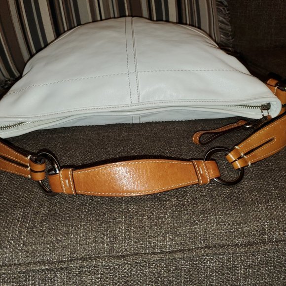 She is in really great condition. I zoomed close to the marks, but they really are not super noticeable in person. She is pretty spotless on the exterior and completely spotless inside. She's like a bone color leather exterior with brown lining. The strap is flawless.