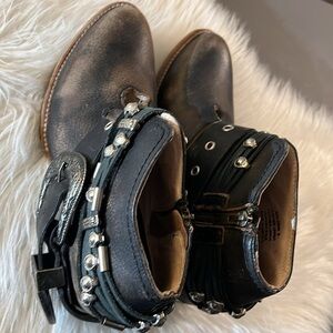EUC Freebird Saloon Distressed Silver Buckle Black/ Brown Booties Size 8