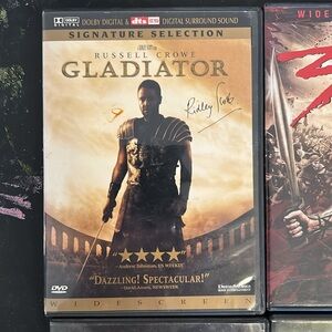 Gladiator 2-disc set starring Russel Crowe as General Maximus who is betrayed, becomes a slave and then a gladiator who is out for revenge. Second disc is all special features. Rated R. Run time 155 minutes.