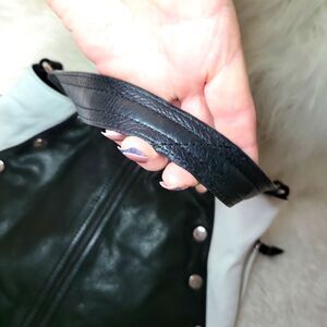 THIS EUC BEAUTIFUL BLACK AND WHITE WITH GORGEOUS SILVER ROUND BUTTON STUDS GENUINE LEATHER, HAS SIDE POCKETS ZIPPERS AND MAGNETIC TOP CLOSURE ALL WORK PERFECTLY!!!! AUTHENTIC B MAKOWSKY!