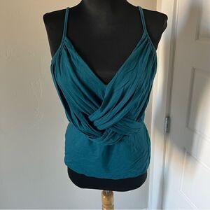EUC excellent used condition Marciano teal v neck tank camisole sz L ruching at front as shown. Beautiful and sexy. Designed to show off your assets while minimizing flaws. Stretchy cotton like material. Measurements in photos. Wear to work, or for date night.