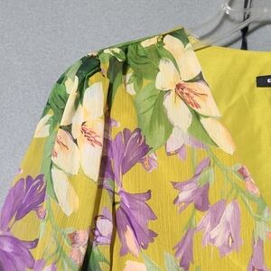 The pre-owned EXPRESS Floral V-Neck Long Sleeve Smocked Cuff Peplum Lined Blouse is a stylish and versatile top for women. Featuring a vibrant yellow floral pattern and a flattering V-neckline, this blouse is perfect for casual occasions in the spring, summer, or fall. The long puff sleeves and smocked cuffs add a touch of femininity to the design, while the pullover closure and lined interior ensure comfort and easy wear. Made from polyester, this blouse is a great addition to any woman's wardrobe, providing a regular fit and basic style that can be dressed up or down as desired.
