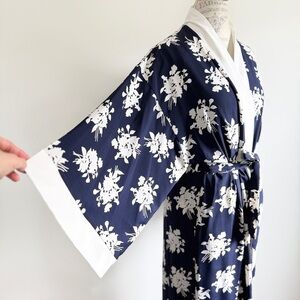 Chic floral robe in midnight blue. Soft fabric with elegant ivory accents. Ideal for relaxation.